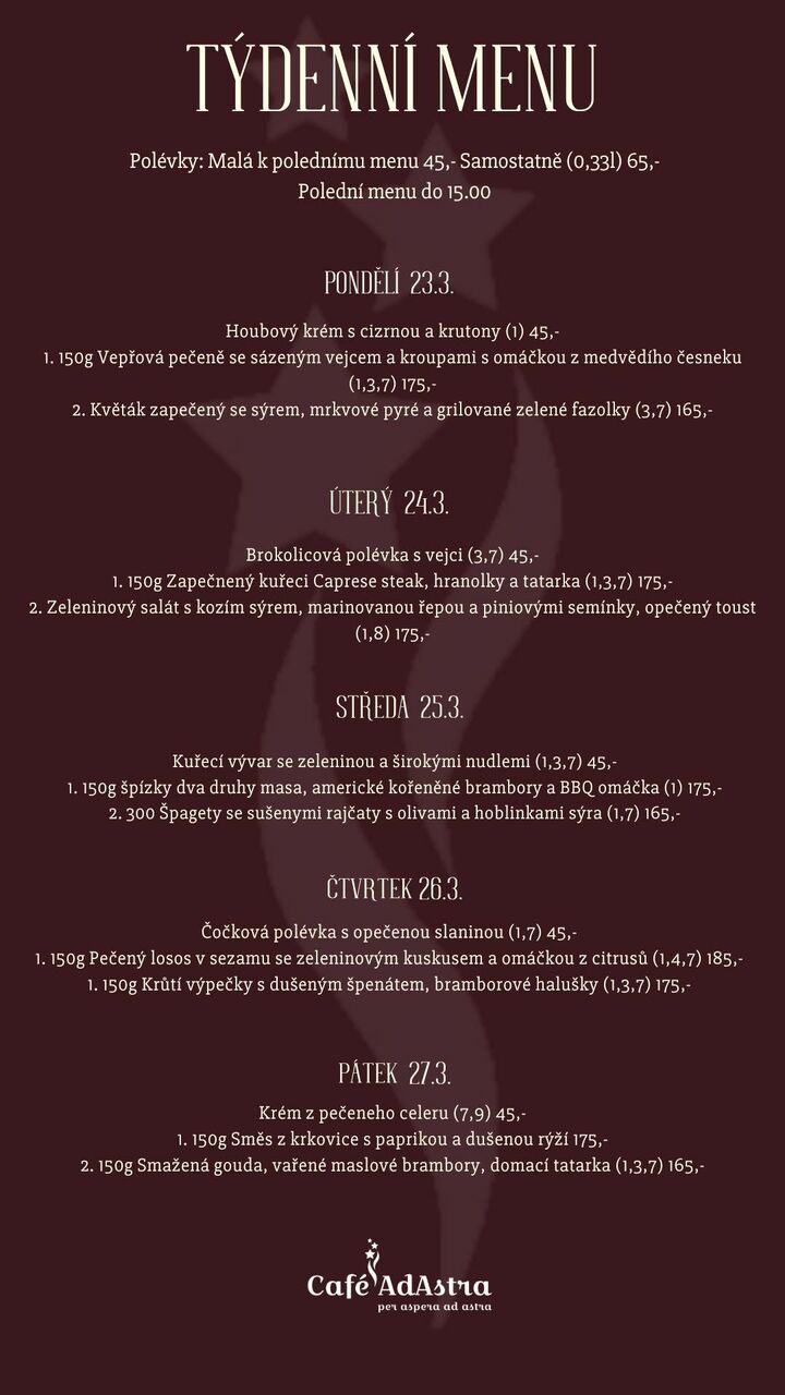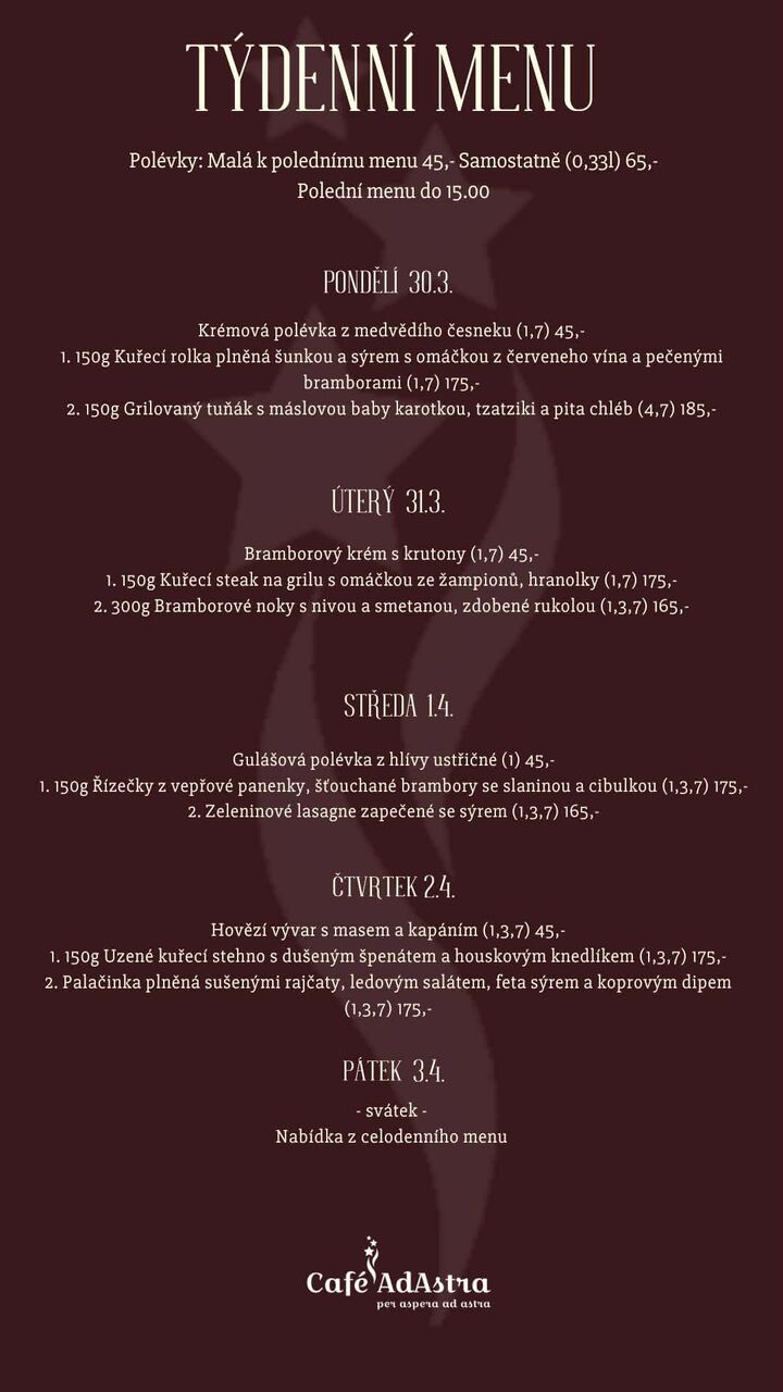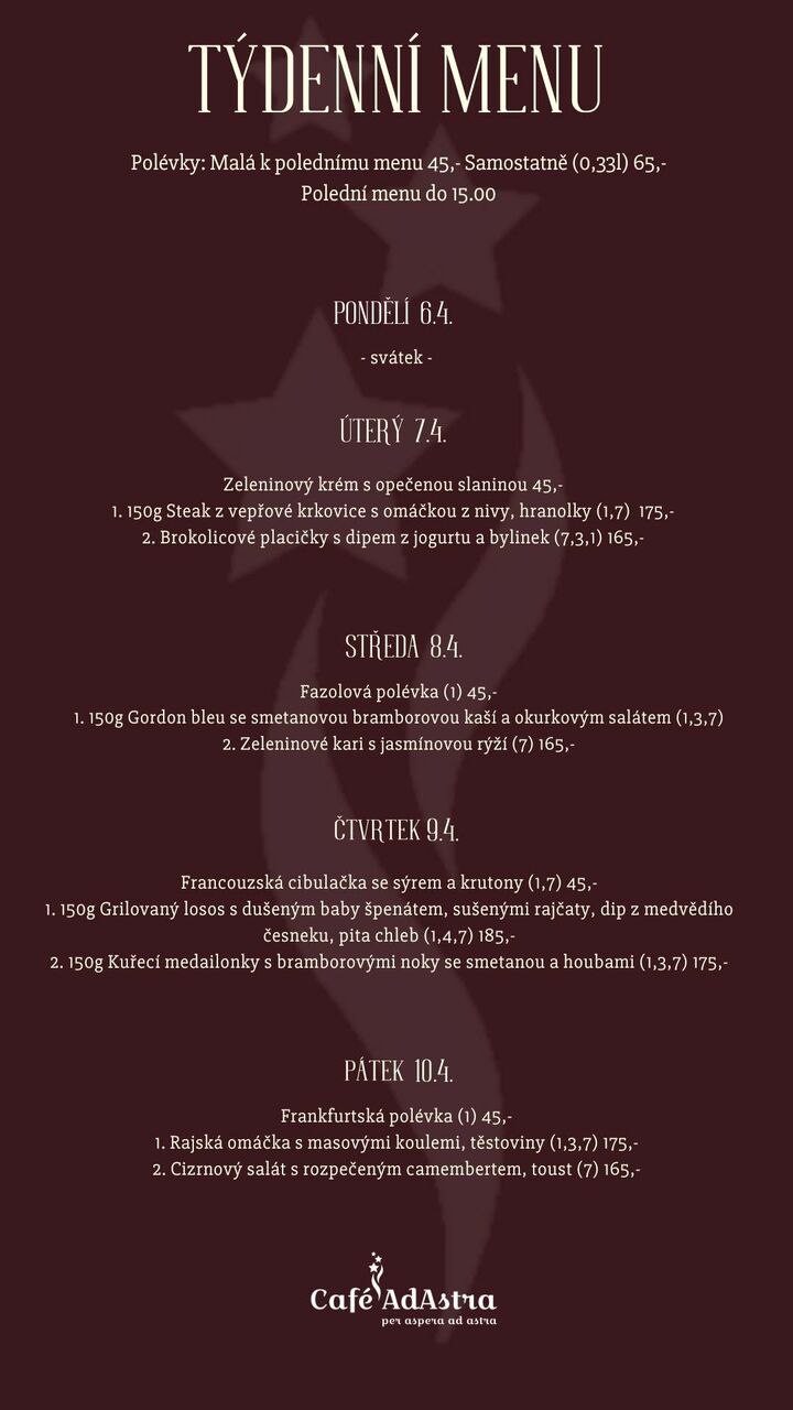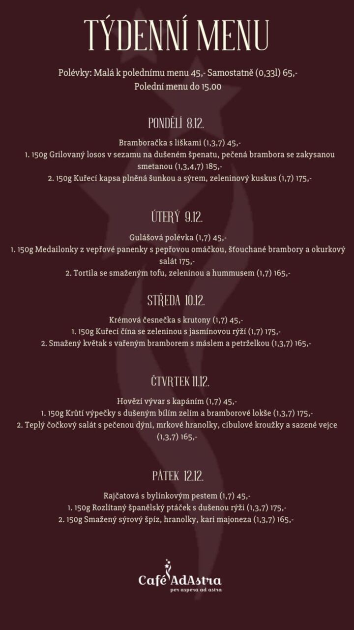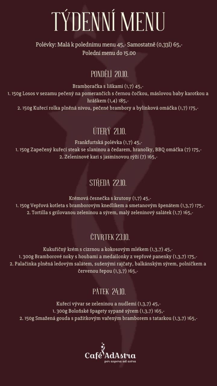 Café AdAstra je příjemné místo, inspirované prostředím francouzských kaváren. Vychutnáte si u nás nejen výbornou kávu s dezerty z naší vitríny, ale také různorodou variaci obědového menu, stálého večerního jídelního lístku či na Vás čekají dobrá francouzská vína. Samozřejmě nesmí chybět ani tradiční české pivo Únětice.